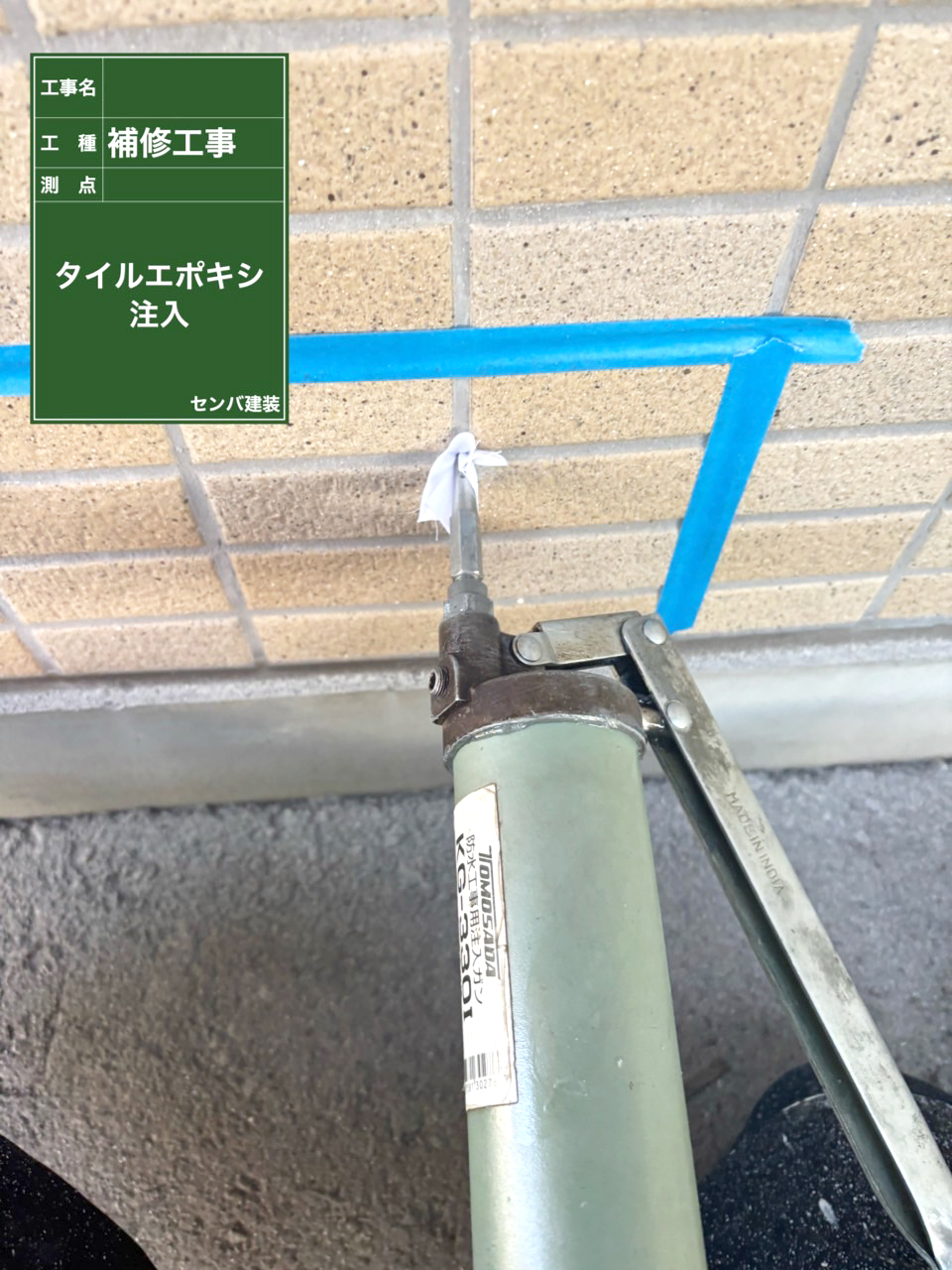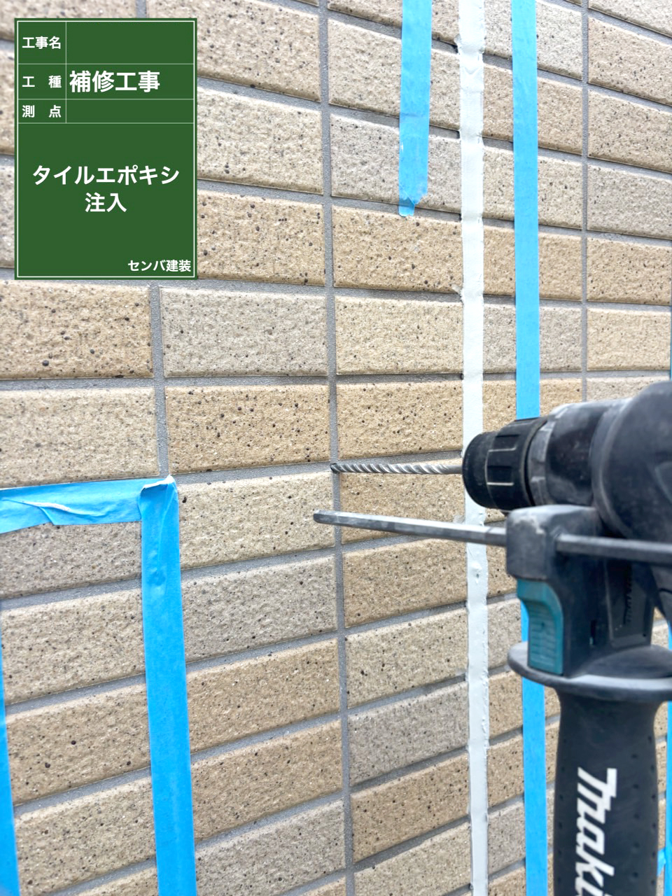 前回はタイルが浮いている範囲が広いために、新しいタイルに張り替える工程をご紹介しましたが、 今回はタイルの浮きが見られるものの、剥がすほど広範囲ではない箇所の事例をご紹介します。 まずはタイル全体の洗浄を行なっていきます。 まずは高圧洗浄でおおよその汚れを落とし、その後タイル専用の薬品で目地とタイルを洗浄していきます。 その後、打診検査で浮きを確認した箇所のタイルとタイルの間に穴を開けて、エポキシ樹脂を注入します。 既存のタイルを活かせることができるのが、この工法の最大のメリットです。