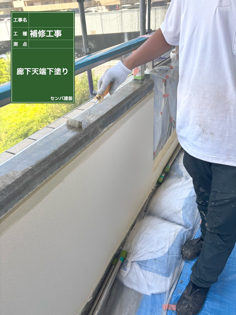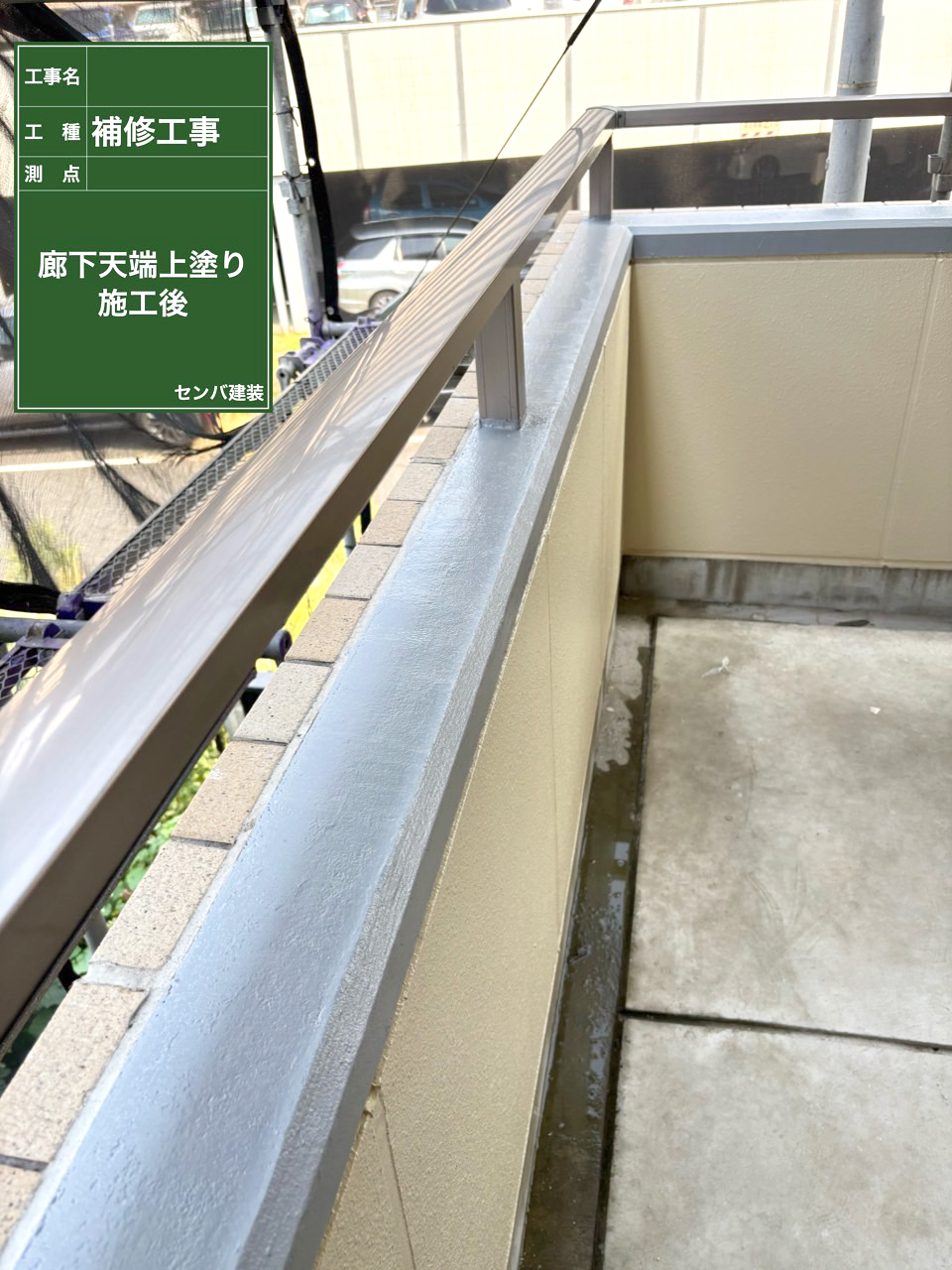 「天端(てんば)」とはいわゆる「手すり」の部分のことです。 実際に人の手があまり触れない箇所ではあるのですが、ここが黒ずんで汚れていると印象はあまりよろしくないですよね。 こちらも汚れを落としたあと、下塗りから上塗りまで三度塗りを行えば 見違えるほど綺麗にすることができます。 ※今回は水性防水の塗料を使用しました。