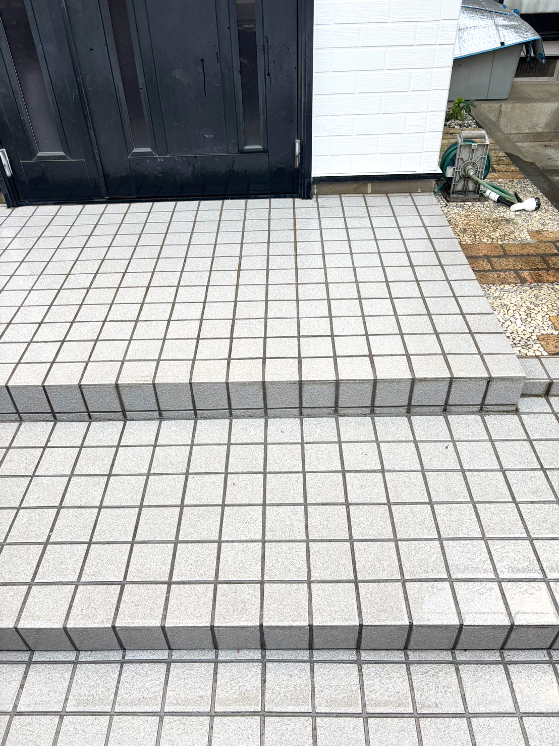 最後に玄関前のタイルが汚れていたので、サービスで洗浄を行いました。 今回はタイル用の薬剤を使って、汚れを浮かせて落としました。 人の出入りする場所なので、汚れてしまうのは仕方ないとはいえ、 お家の顔にあたる玄関前なので、綺麗になると一層良い仕上がりに感じますね。