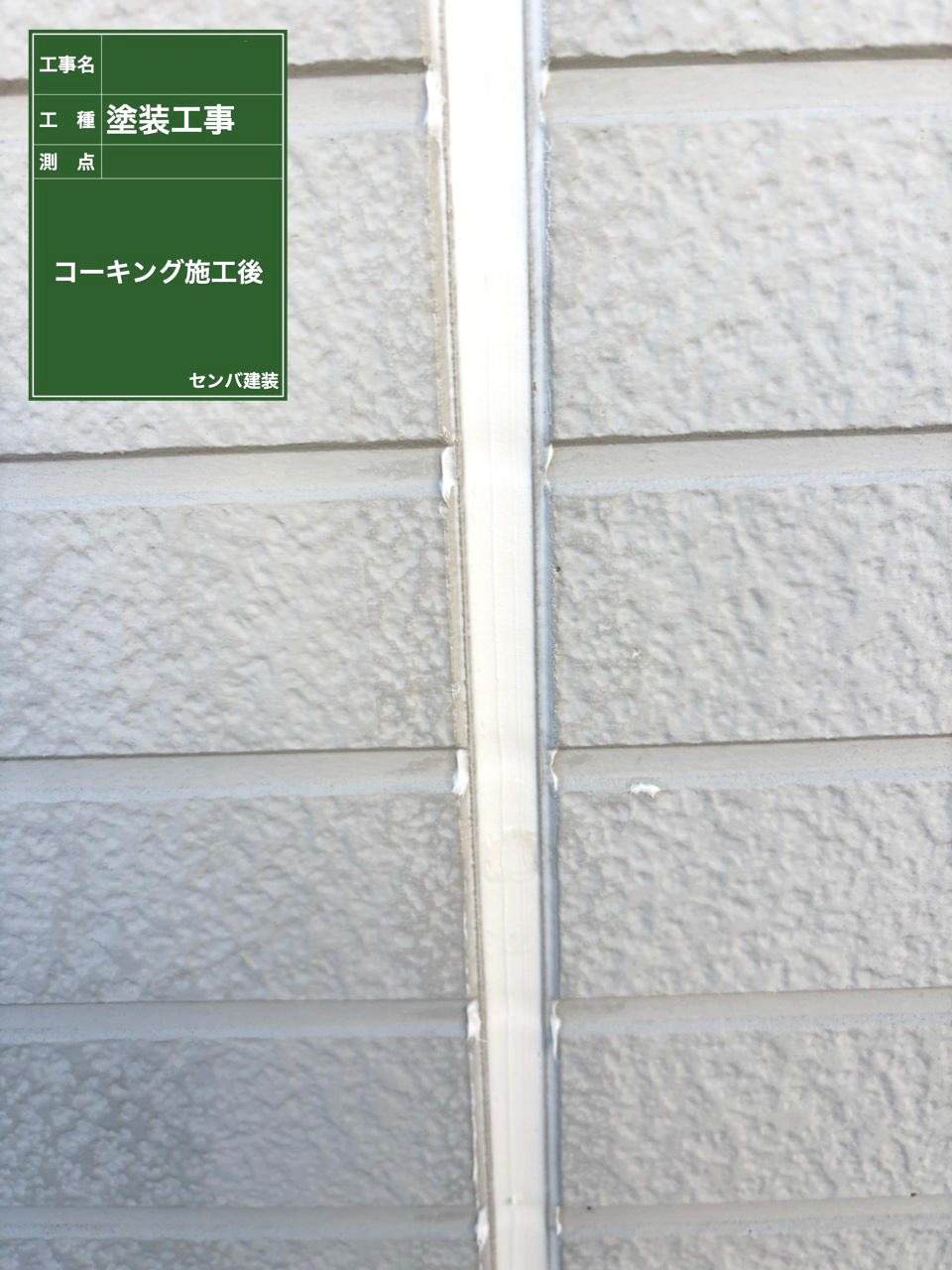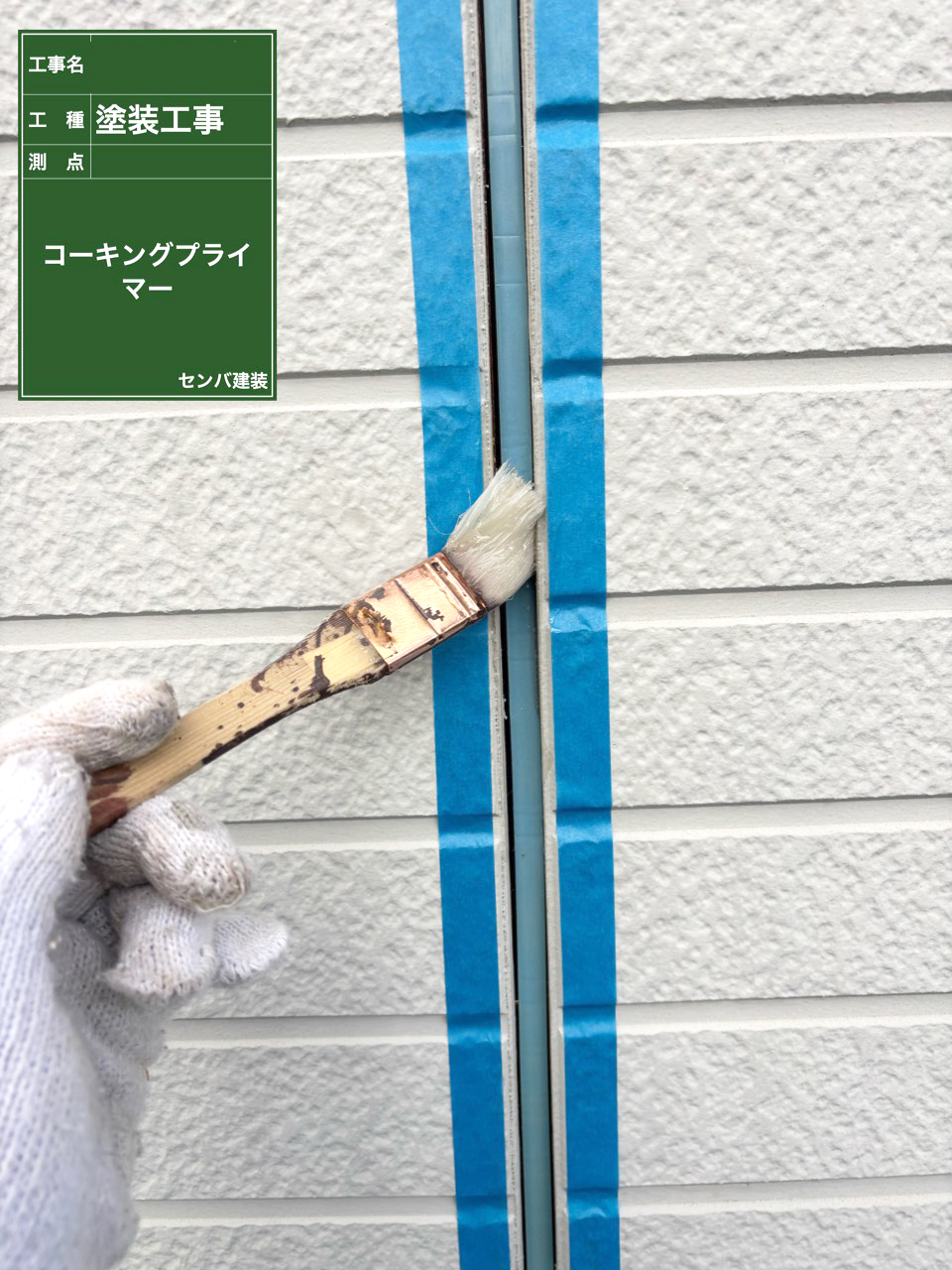 外壁のコーキングを打ち替えていきます。 コーキングはゴムのような素材のため、劣化すると割れやすくなります。 そこから雨水が入ると、雨漏りの原因になってしまうのです。 コーキングの劣化は、「弾力がない、落ち窪んで見える」ことで判断できます。 古いコーキングを切り出して、プライマー(新しいコーキングの定着をよくするもの)を塗ってから、 新しいコーキングを充填していきます。